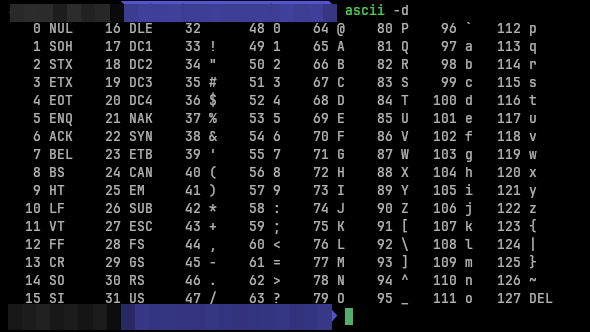 Incidentally, the ASCII standard is a supremely elegant bit of design: read this post if you want to know more!